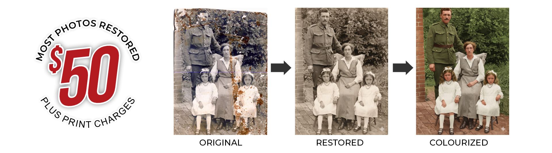 Have us re-colourize sun-bleached and faded photos, fix tears & cracks, nasty scratches, and heavily damaged areas. Even colourize black and white originals. No obligation quotes provided.