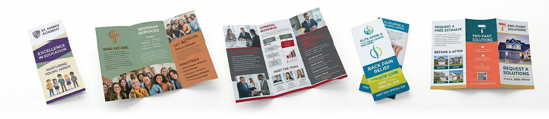 Showcase your business or organization in an impressive way. The perfect compliment to your business card. Full colour printing on 100lb gloss text paper, tri-folded ready to hand-out with fast production.
